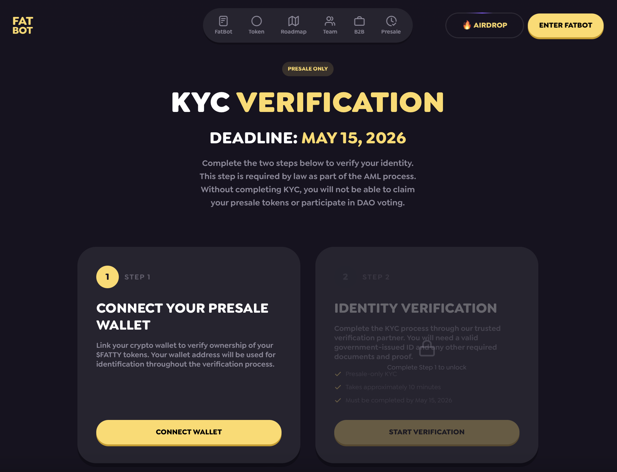 To become eligible to claim Fatty tokens purchased through the official presale, users are required to complete KYC verification. This is an AML requirement and cannot be waived. If requested by the relevant authorities or regulators, we are required to provide the necessary data in order to remain compliant with AML regulations. The KYC process is conducted through an official third-party integration with AMLBot, ensuring independent assessment of all KYC results.