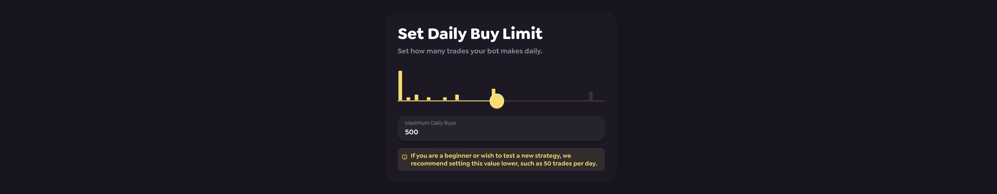 The Daily Buy Limit specifies the number of buy transactions your Sniping 2.0 trading bot may execute within a 24-hour period. Remember: trading bots automatically execute orders based on your settings, so your bot may execute zero transactions - or trade over 10,000 tokens in a single day, all depending on how strict your criteria are.